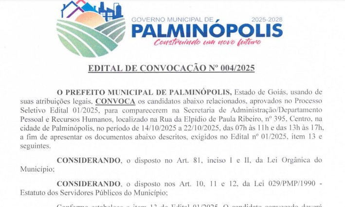 Edital de CONVOCAÇÃO Nº 004/2025 – PROCESSO SELETIVO; O PREFEITO MUNICIPAL DE PALMINOPÓLIS, Estado Goiás, no uso de suas atribuições legais, CONVOCA, os candidatos abaixo relacionados, aprovado no PROCESSO SELETIVO Edital 01/2025, para comparecer a Secretaria de Administração/Departamento Pessoal e Recursos Humanos, e apresentar os documentos citados no Edital; Edital de Convocação Nº 004/2025 –… Read more »