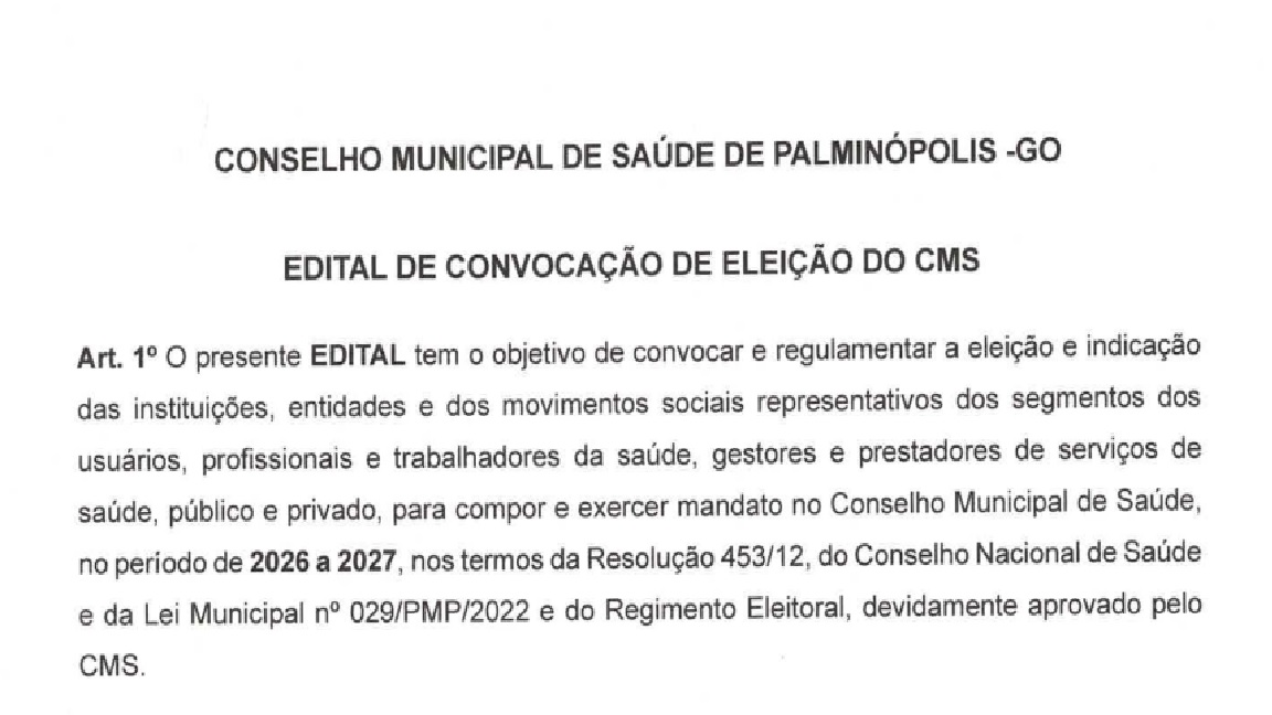 o presente EDITAL tem objetivo de convocar e regulamentar a eleição e indicação das instituições, entidades e dos movimentos sociais representativos dos segmentos dos usuários, profissionais e trabalhadores da saúde, gestores e prestadores de serviço de saúde, público e privado, para compor e exercer o mandato no Conselho Municipal de Saúde no período de 2026 a 2027, nos termos da resolução nº 453/12, do Conselho Nacional de Saúde e da Lei Municipal Nº 029/PMP/2022 e do Regimento Eleitoral, devidamente aprovado pelo CMS.